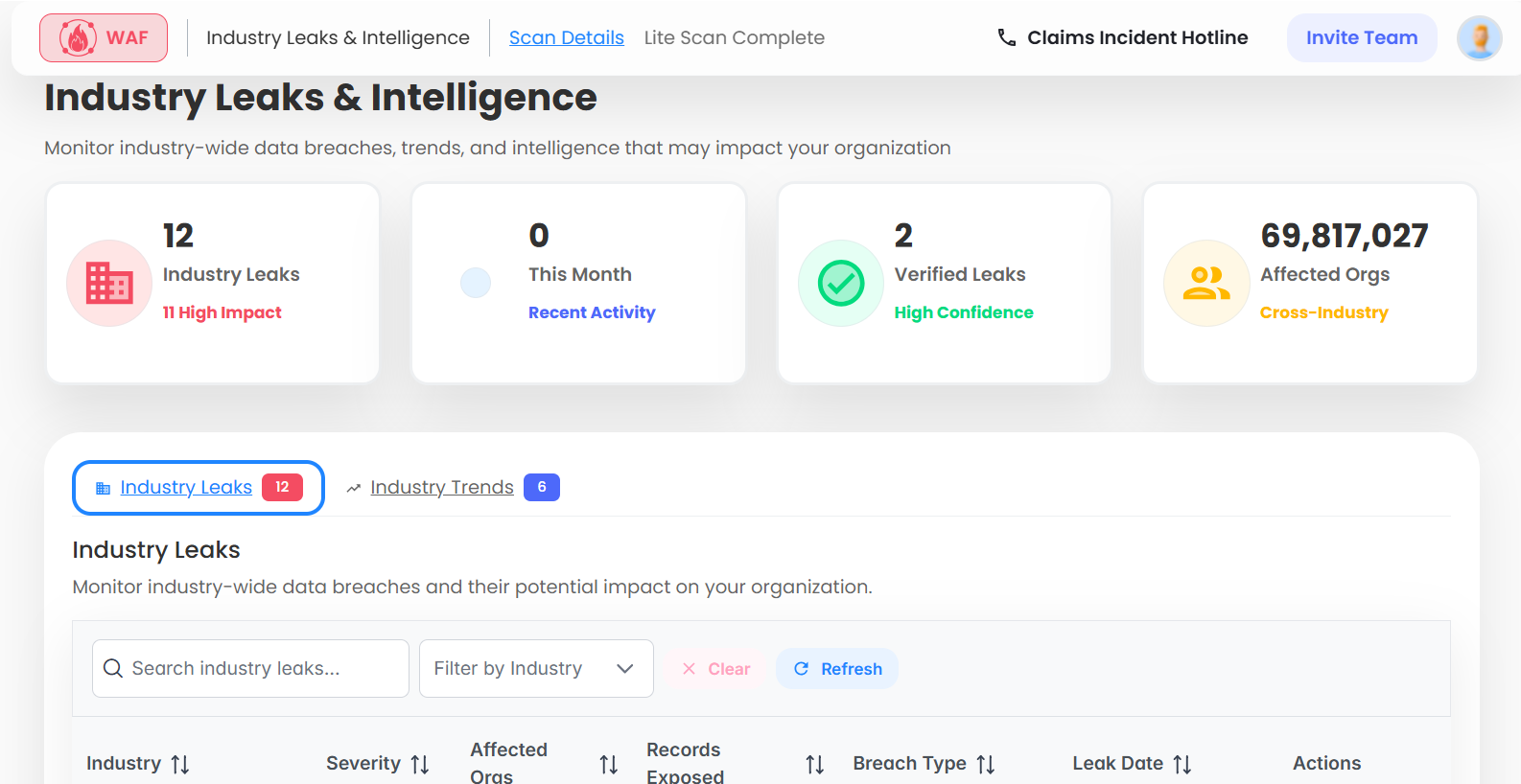 Cyber threats often affect multiple organisations within the same industry. The right software tracks sector-wide breaches and highlights how they may impact your business. This includes the number of affected companies, the volume of records leaked, and the types of attacks involved.