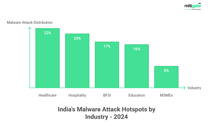 Some industries are inherently more attractive to cybercriminals. Healthcare is the most targeted industry, accounting for about 21.82% of all cyber threats detected in India. This is followed by the hospitality and BFSI industries, respectively.